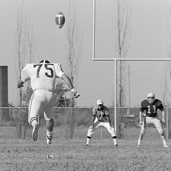 Football kickoffs are easy to photograph... and frankly pretty boring. But this one, with the ball caught in a perfect vertical spiral, the kicker still up in the air, the Bethany player waiting to receive the kick at the far end of the field, and the referee watching over the play, is just about perfect. And I planned none of it.